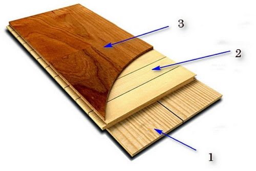 Древесные слои в структуре паркетной доски находятся перпендикулярно друг относительно друга, что повышает прочность, устойчивость к механическим ударам, колебаниям температур, делает ее влагоустойчивой.